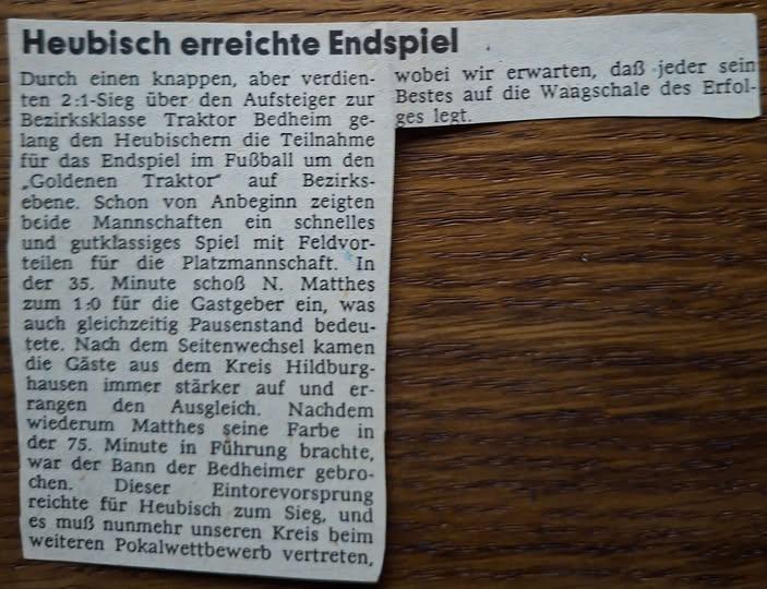 Im Jahre 1970 wurde der Kreis Sonneberg durch unsere Mannschaft im Bezirk vertreten. Dabei kamen unsere Fußballer bis ins Endspiel welches in Themar ausgespielt wurde und das man erst in der Verlängerung mit 2:1 verlor (Torschütze für unsere Mannschaft: Walter Schulz).